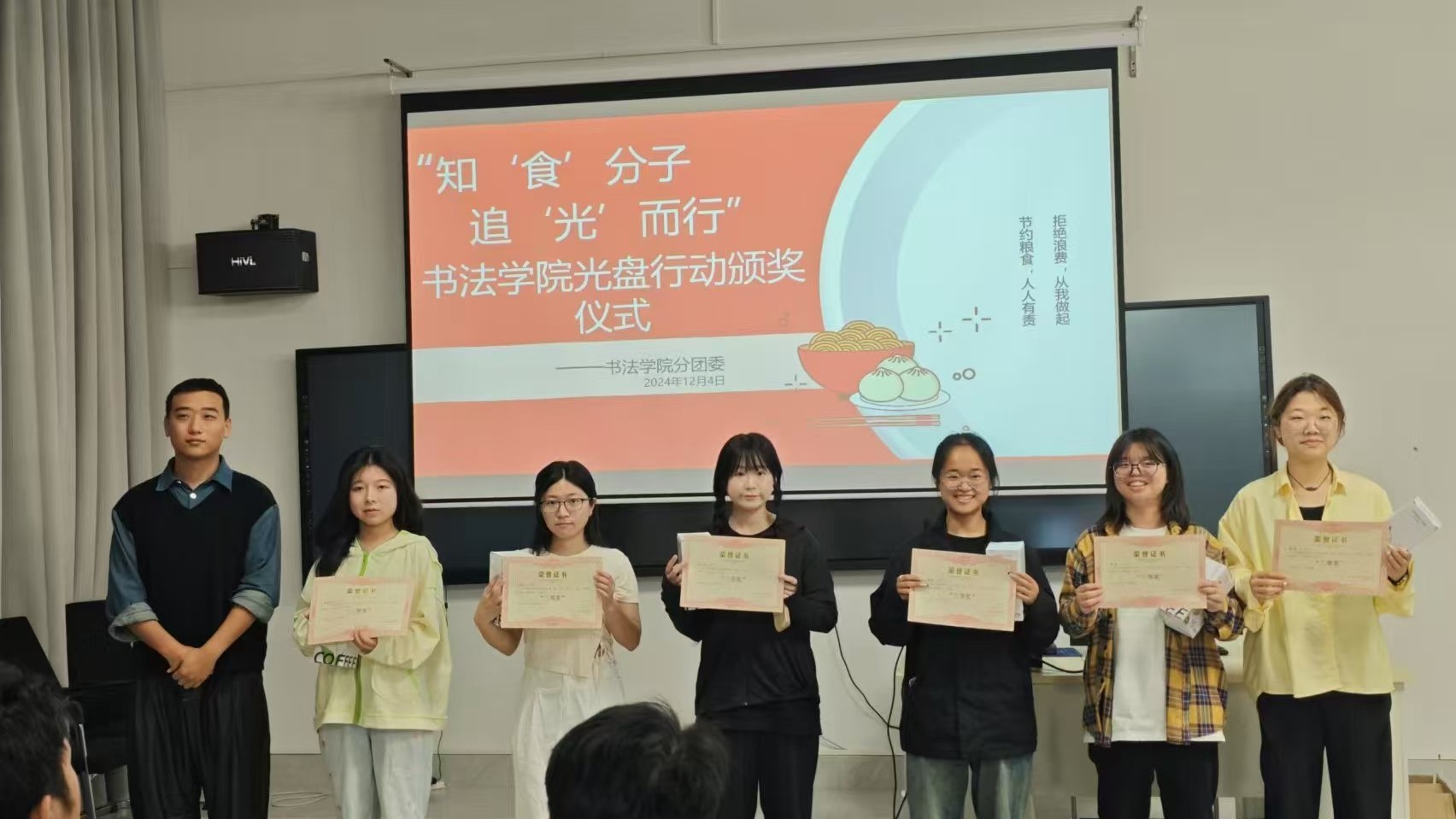 本次“知‘食’分子,追‘光’而行”光盘行动的颁奖仪式于12月4日在南校区艺德楼507书法教研室进行由书法学院常务副院长苏乃从、党支部书记喻广林、学工办主任兼分团委书记李家琪、实验室主任宁梦宇等领导教师为获奖同学颁奖。