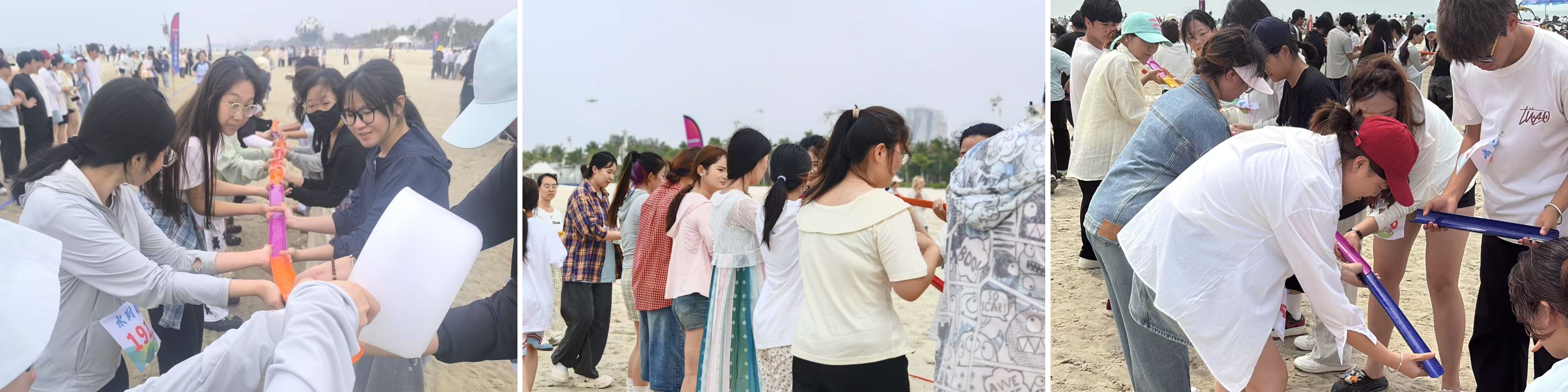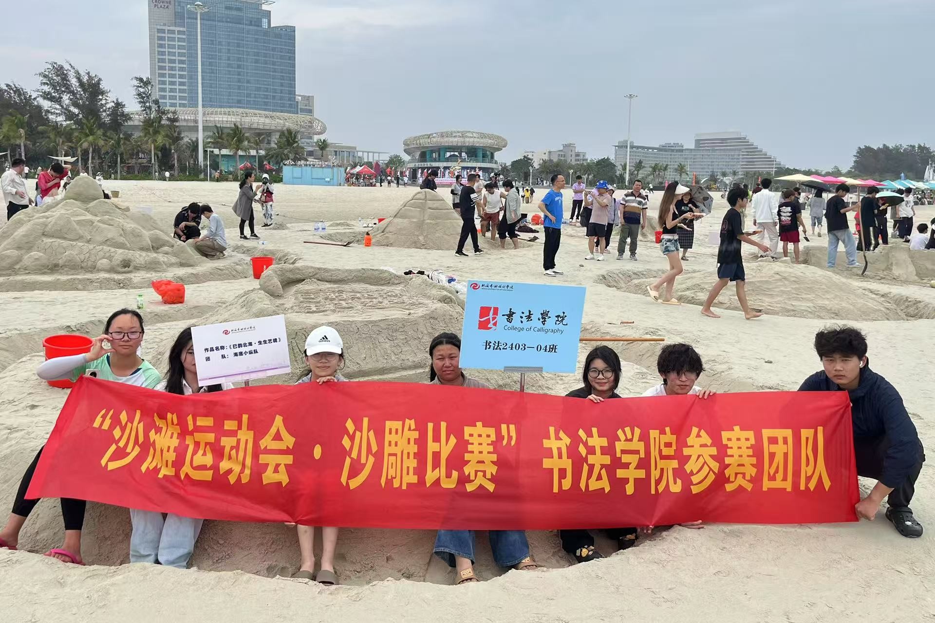 在沙滩排球赛场上,白色排球在蔚蓝天空与金色沙滩间穿梭,每一次精彩攻防都引发观众阵阵喝彩,水到渠成比赛考验团队默契,书法学院队员们手持U型槽,小心翼翼传递着水源。沙雕选手们更是巨型铲子、小水桶、雕刻刀等工具齐上阵,潮湿的沙粒在手中逐渐成型。还有同舟共济、袋鼠跳、巨人脚步等趣味项目,展现了书法学院学子在此次沙滩运动会中的运动活力。