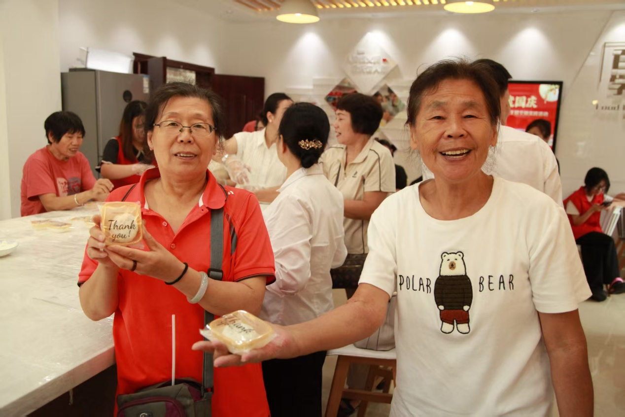 月饼制作区,文学院志愿者细致地为老人们演示月饼制作过程。当一个个外形饱满、花纹细腻的月饼逐渐成型时,现场洋溢着满满的成就感。最后,志愿者们与老人一同将月饼送入烤箱,共享等待美味的温馨时光,香甜的气息弥漫在社区的每一个角落。