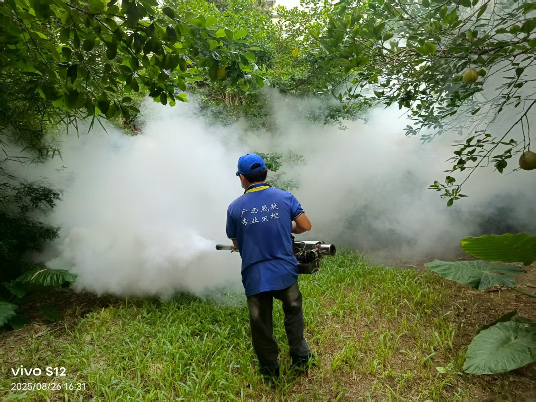 8月26日,我处聘请广西晟冠环境科技有限责任公司采用高压喷洒、成品投放、烟枪热烟喷雾、滞留喷洒等灭蚊方式,对校园办公楼、教学楼、宿舍楼、食堂、厕所、校园绿化带、操场、下水道等易滋生蚊子的场所进行全面消杀,降低蚊虫密度。