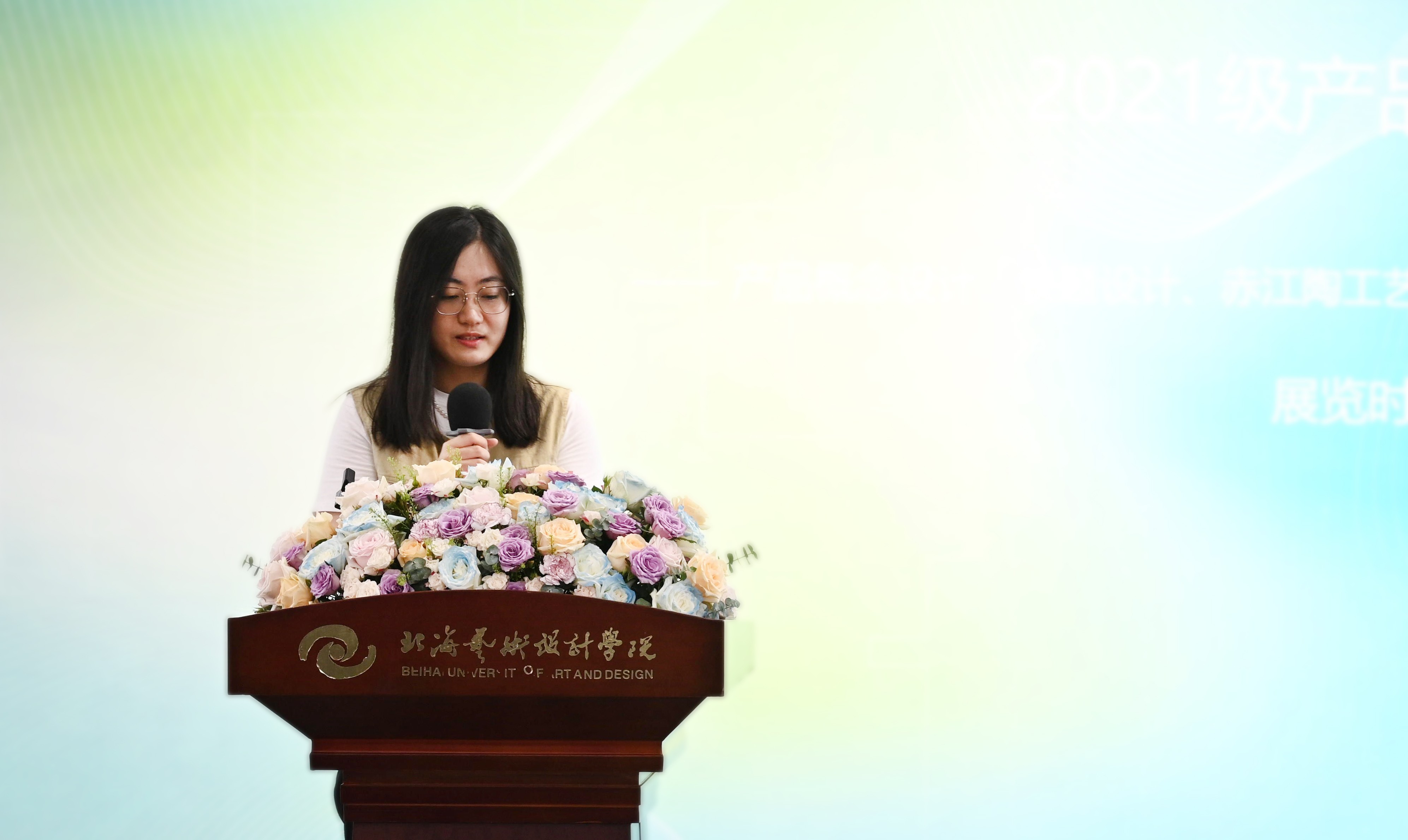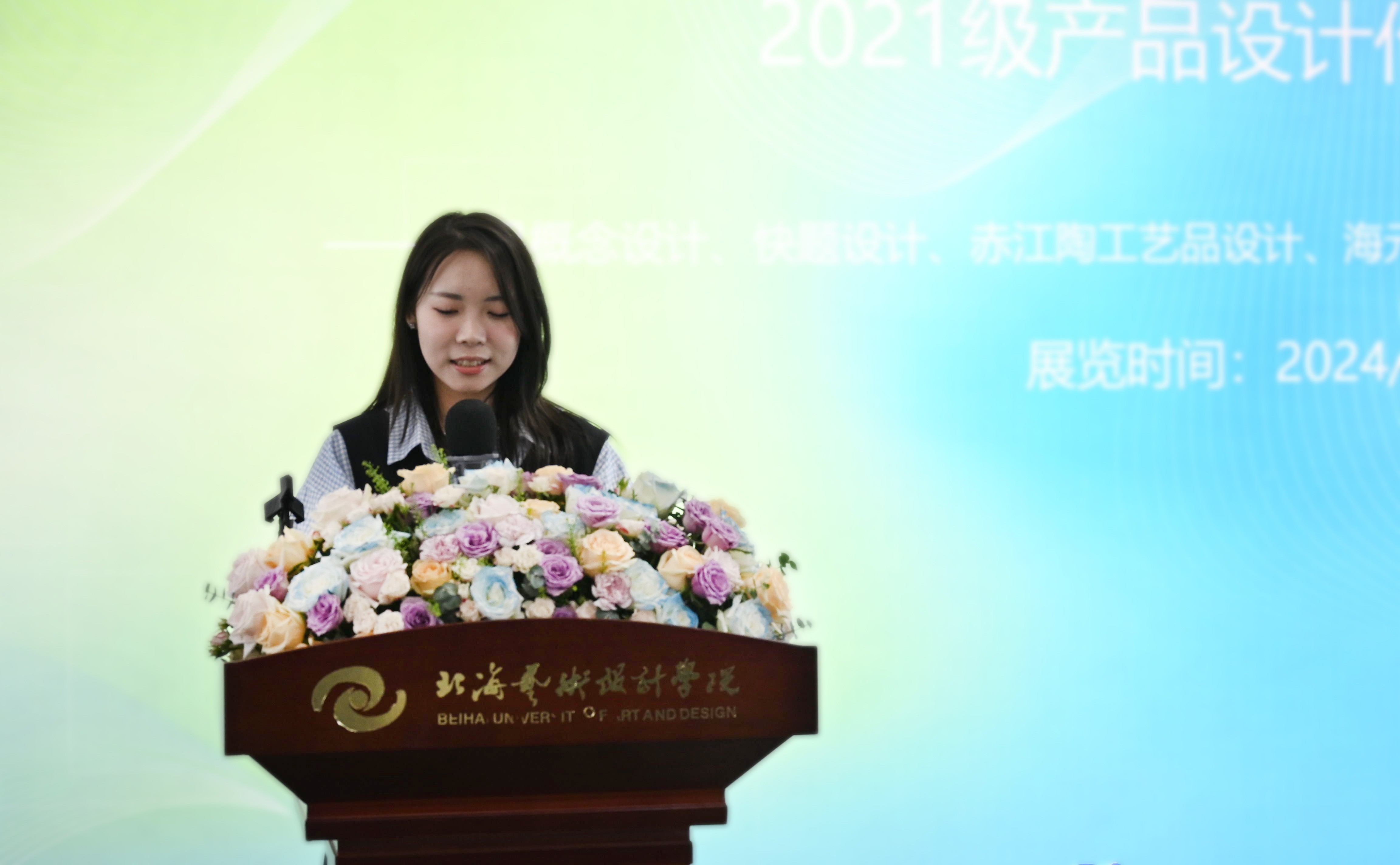 专业教师代表于易辰在发言中,首先对同学们的热爱与执着、创意与才华以及智慧与心血表示肯定,她认为本次产品设计作业展是对同学们专业学习成果的阶段性的展示,也是对同学们设计能力的深入检验。这场展览不仅是一场视觉的盛宴,更是一次心灵的洗礼。最后为即将前往北京学习的2021级产品设计专业学子送上最真挚的祝福。