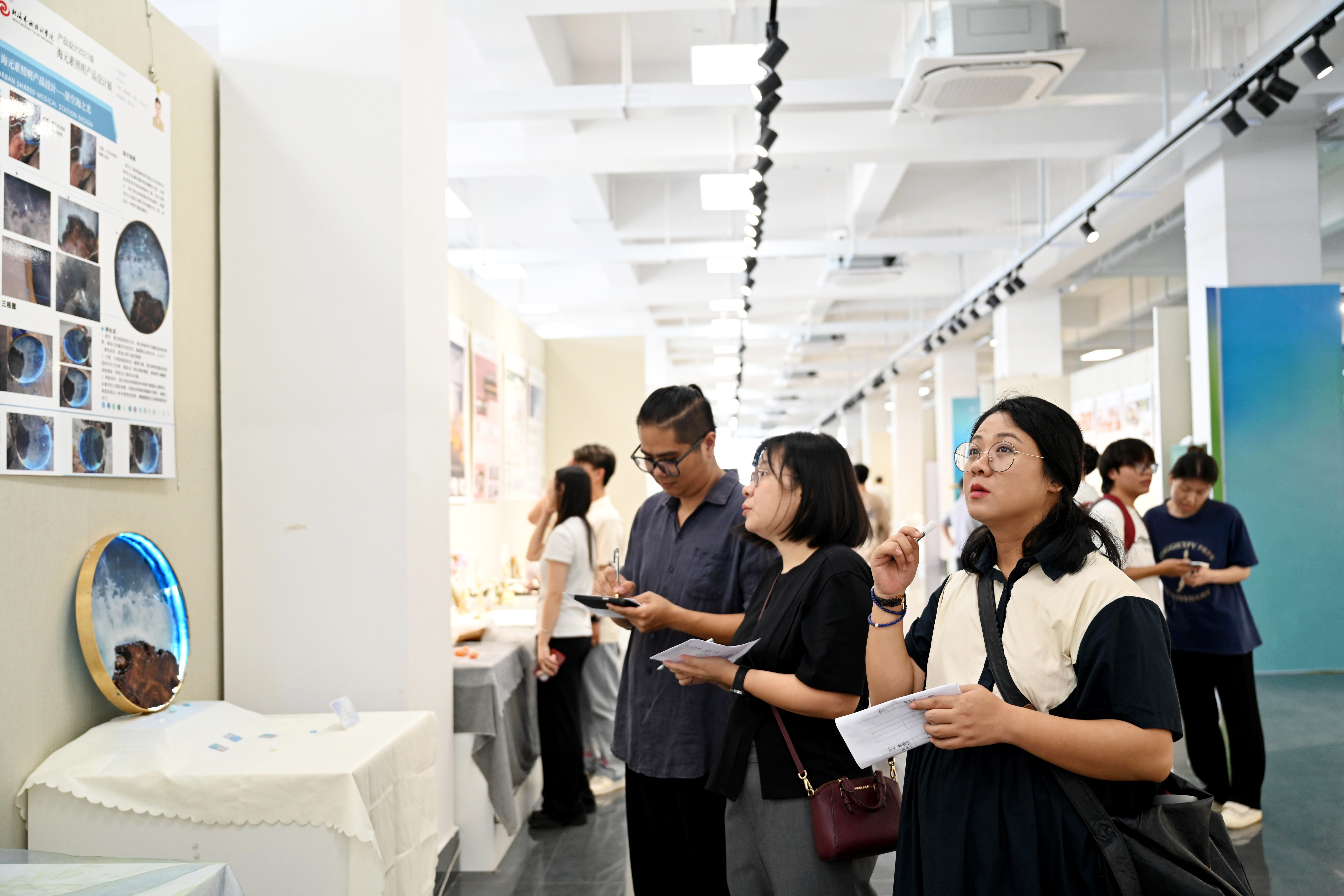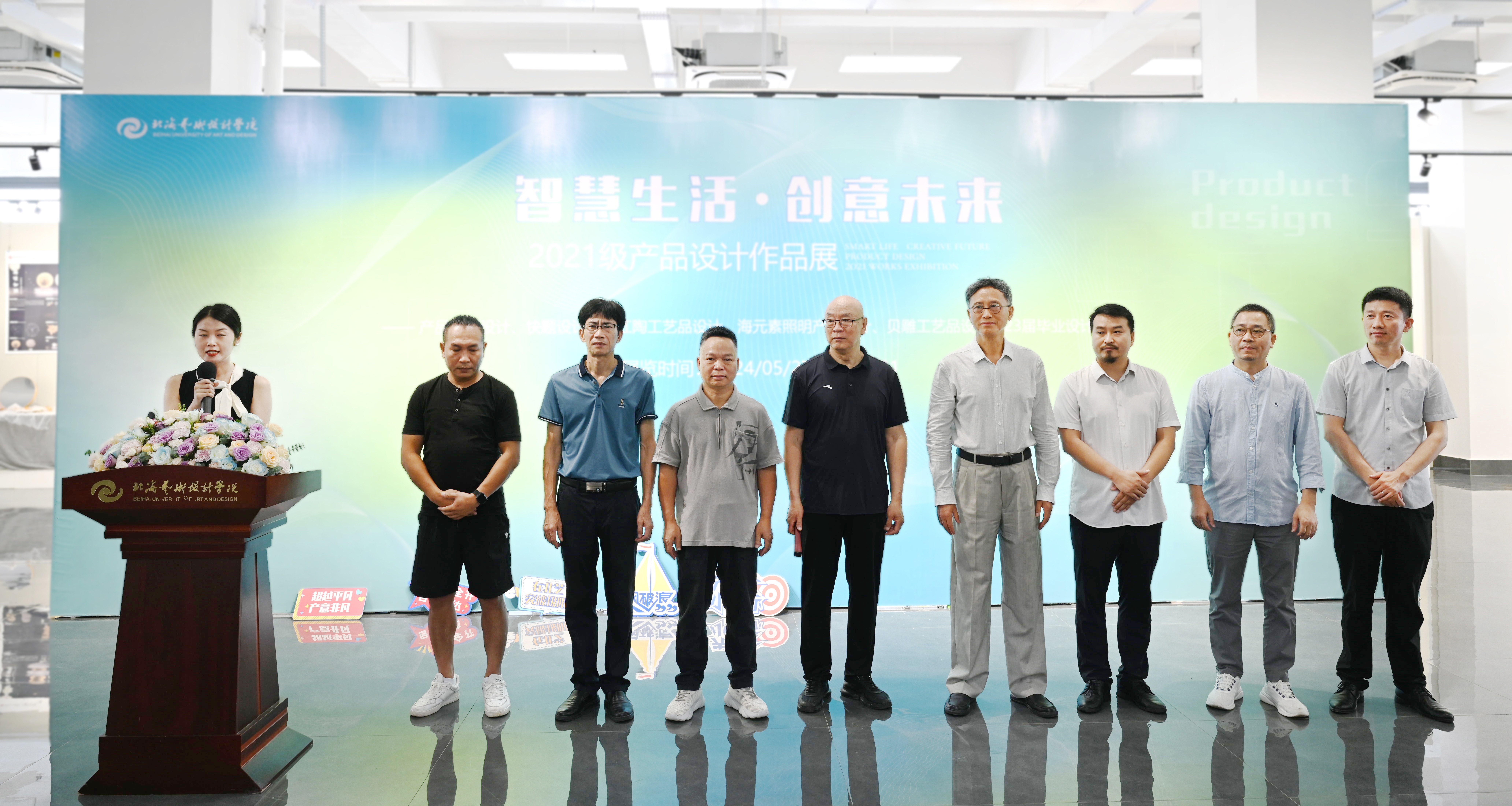 2024年5月27日上午,我院产品设计专业“智慧生活·创意未来——2021级产品设计作品展”在南校区艺德楼8楼北侧展厅拉开帷幕。此次展览集结了产品设计专业学生们的创新成果,吸引了众多嘉宾的关注和参与。校长卢新华、中国工艺美术大师利成世、学院院长李林平、副院长白建强、贾荣建教授、北海市工业发展促进中心工艺美术科科长钟志慧、广西工艺美术大师陈建炜、北海喜蛙家居设计有限公司总经理何一夫及产品设计专业师生们共同出席了开幕式。开幕式活动由产品设计专业教师陈书娟主持。