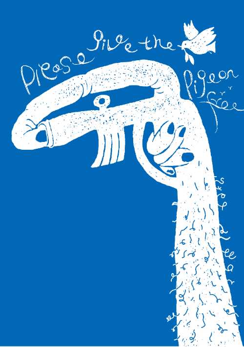 作品由人的手与枪结合,但手指又堵住了枪口,说明战争时期,士兵其实内心也不希望打仗,也想要和平。背景为和平鸽和蓝天,表现出渴望和平与自由的感觉。