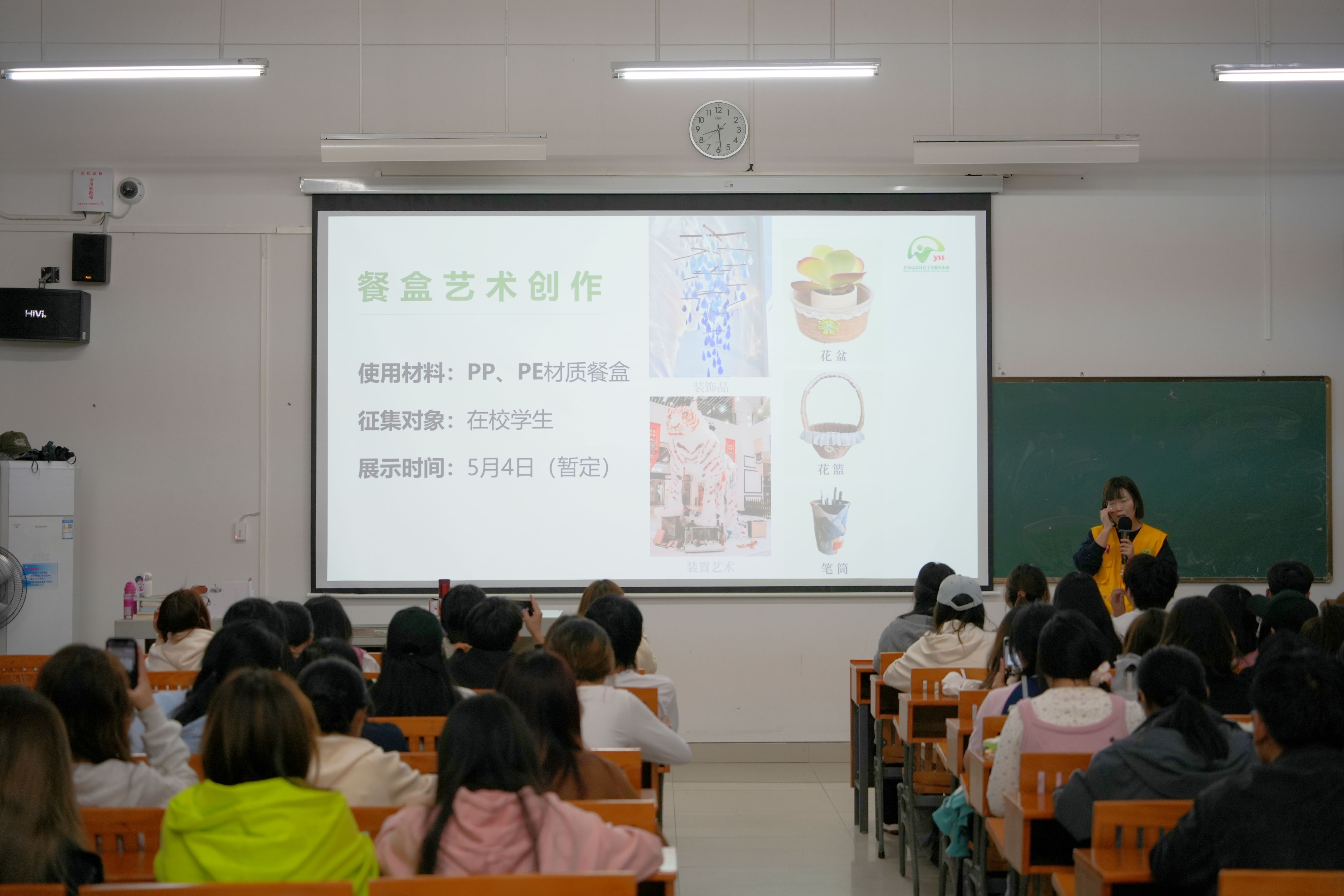 为了向更多的学生普及塑料制品的回收价值,引导学生结合创意思想对废弃餐盒进行再次创作,服务中心老师面向全校学生开展主题创意海报比赛及餐盒艺术创作。