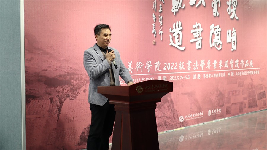陶立阳副校长在致辞中对美术学院书法学专业建设进行回顾,对书法学专业的采风实践课程成果给予充分肯定,对书法学专业师生未来的艺术创作寄予美好祝愿与期盼。