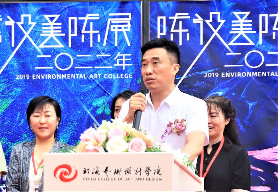学校副校长陶立阳致辞,他表示此次展览激发了师生的创作热情,促进了专业教学质量提升,生动真实地呈现了教师对于人才培养目标所做出的辛勤努力。展览作品风格多样,表现形式各异,凝聚了学生辛勤耕耘的汗水,融合了学生的执着和追求,充分展示了学生对设计的感知和感悟,饱含理想和希望,让观众回味无穷。陶立阳表示,新时代赋予设计师新的使命与担当,设计师在做好自己的本职工作同时也要勇于承担起社会责任,为快速发展的社会贡献自己的一份力量,努力创作无愧时代的优秀作品,希望每个人都能将专业发展融入祖国民族的伟大发展之中。