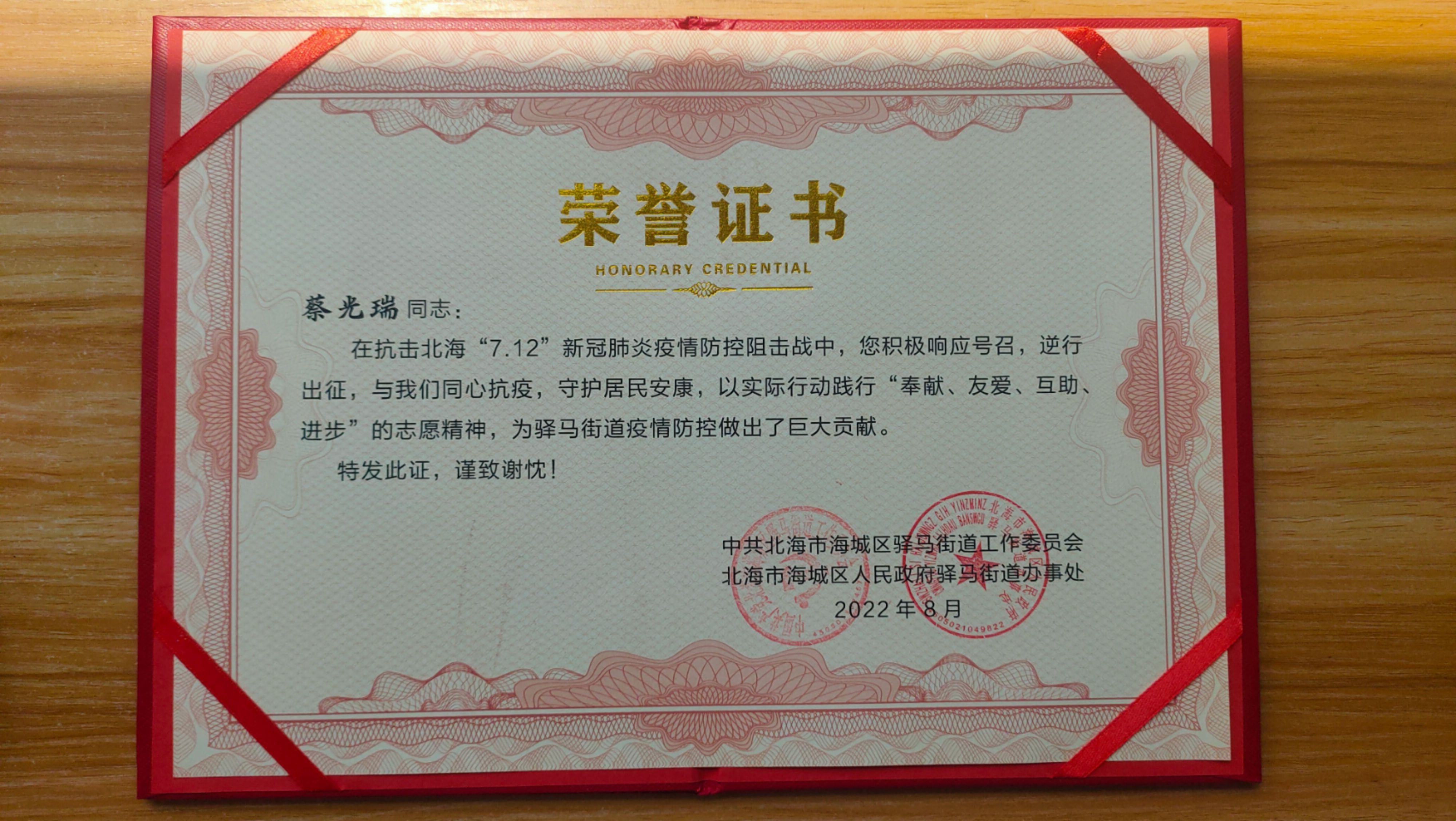 2022年7月北海发生了使全市“宕机”一个月的严重疫情,在突发灾难面前,许许多多的志愿者站了出来,他们不顾自身安危,积极响应疫情防控狙击战的号召,逆行出征,与政府工作人员一道同心抗疫,守护居民安康,为北海市疫情防控做出了巨大贡献。北艺设备与信息处的蔡光瑞老师就是其中一份子,由于他出色的志愿工作,他所在的社区为他颁发了“抗疫勇士”荣誉证书! 你我皆平凡,危难之时方显英雄本色,我们为身边有这样的勇士而感到安心和自豪,向勇士们学习!
