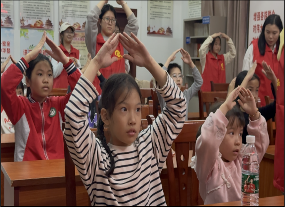 音乐课上,主讲志愿者带领孩子们一同学习《国家》这首歌。她向小朋友们讲解了“国家”的概念,让小朋友们深刻体会到歌曲中蕴含的深厚爱国情怀。志愿者们逐句教唱,从旋律到歌词,每一个细节都力求完美。他们还通过手势舞的方式进行演绎,小朋友们学习热情高涨,跟着老师的节奏,一遍遍地练习,歌声在社区内回荡,传递着对祖国的无限热爱。